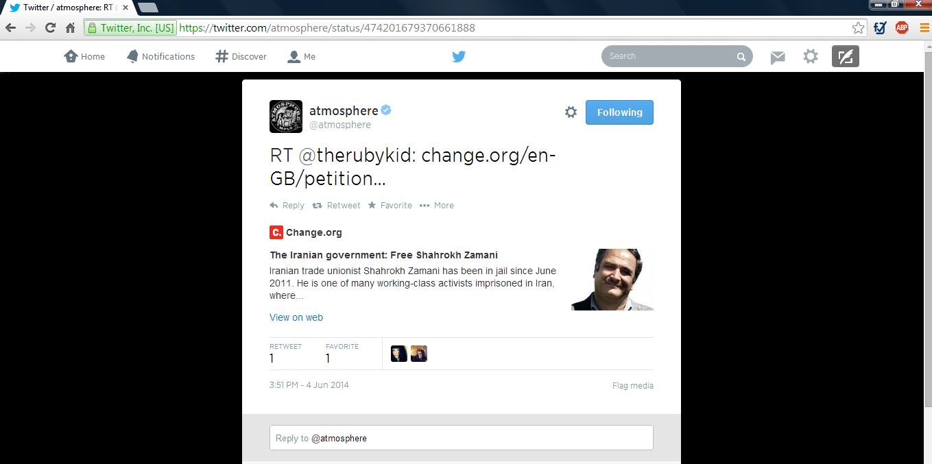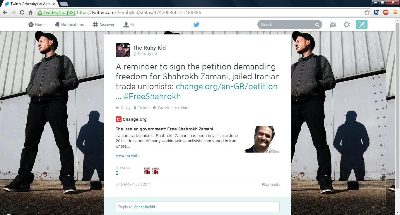 They were responding to an approach from UK hip-hop artist and spoken-word poet The Ruby Kid, who has used his Twitter account to promote the campaign to Free Shahrokh Zamani:
