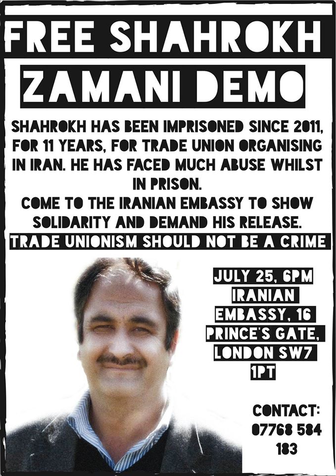 Come to the Iranian Embassy to show solidarity with Shahrokh Zamani and demand that the Iranian authorities release him immediately – trade union activism should not be a crime!