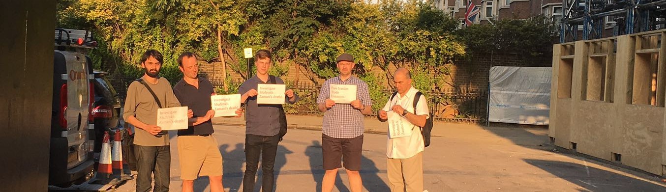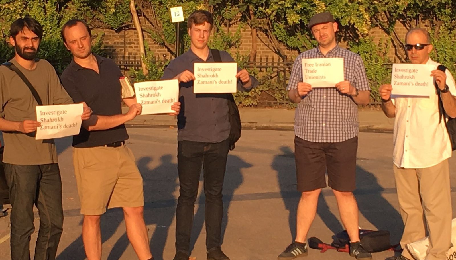 Supporters of the Shahrokh Zamani Action Campaign gathered at the Iranian regime’s London embassy today. We were commemorating the life of Shahrokh a year on from his death in prison and standing in solidarity with all Iranian workers and youth struggling for the right to organise, for democracy and freedom from repression.