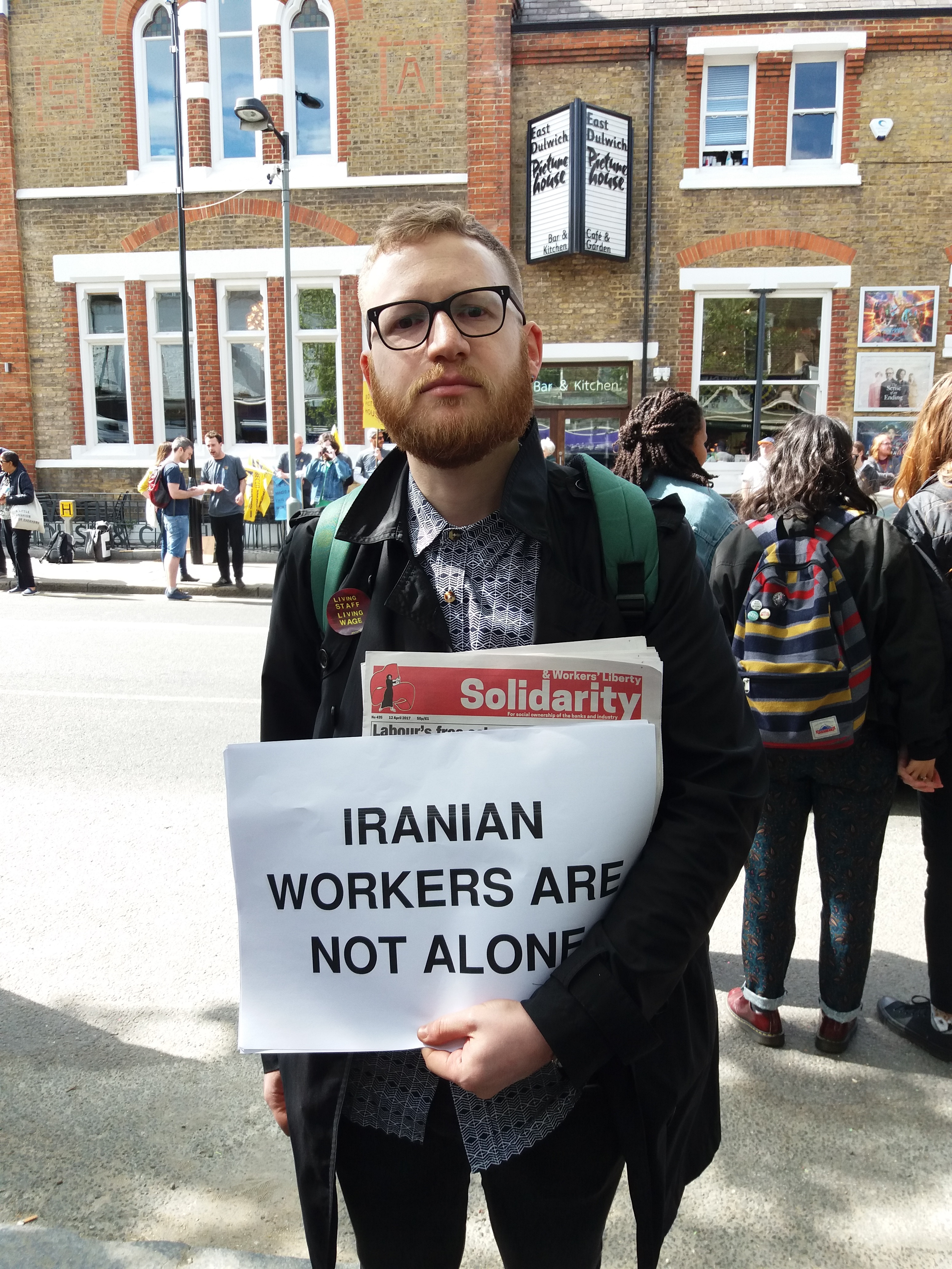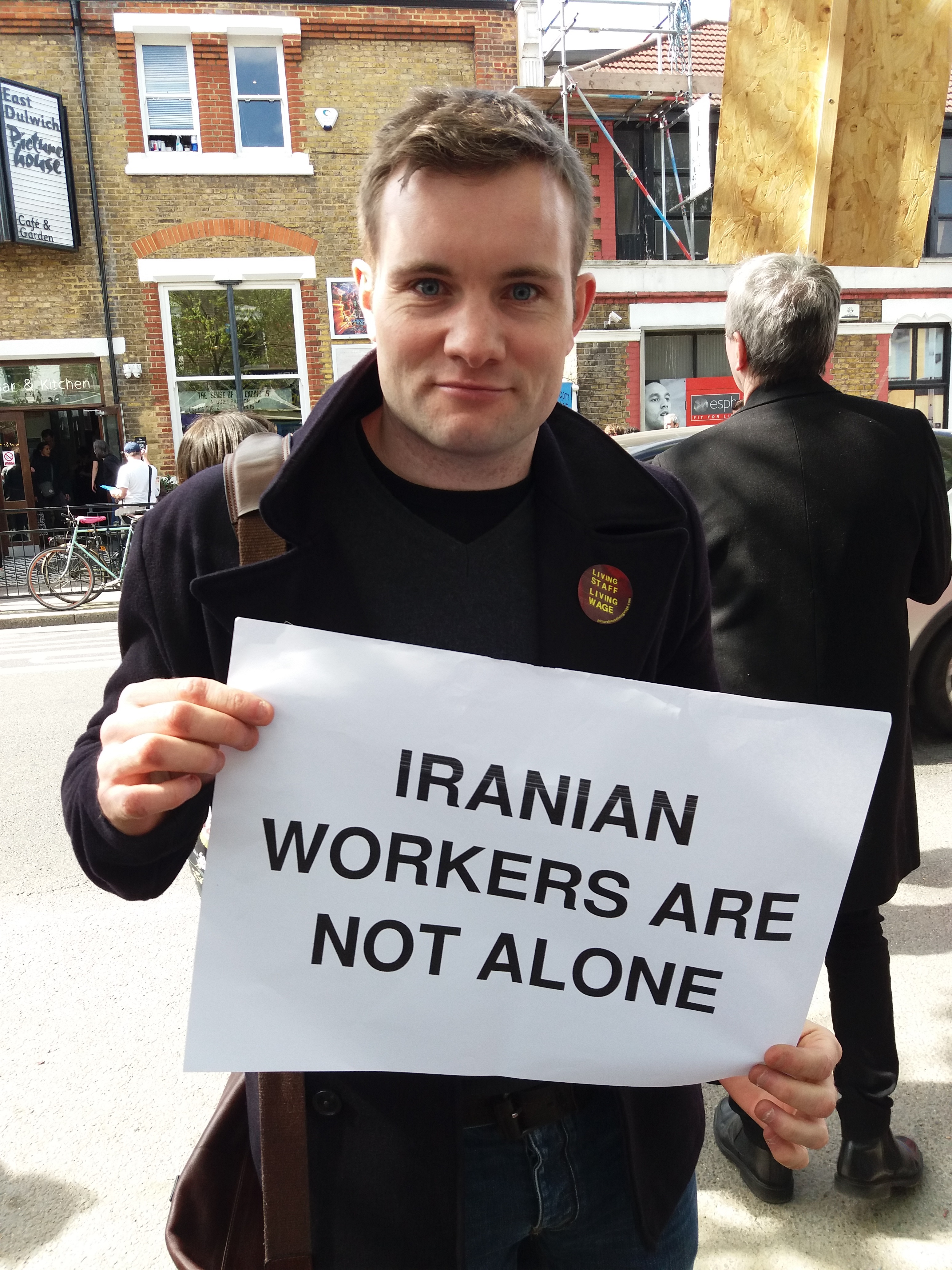 Daniel Randall, RMT rail and transport workers’ union London Transport committee Young Members’ Officer, showing his solidarity with Iranian workers’ struggles.