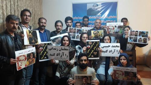 The slogans on the posters include: “Free Esmail Abdi!”, “Free Mohammad Habibi!”, “Free jailed teachers!” and “A teacher’s place is not in jail!”